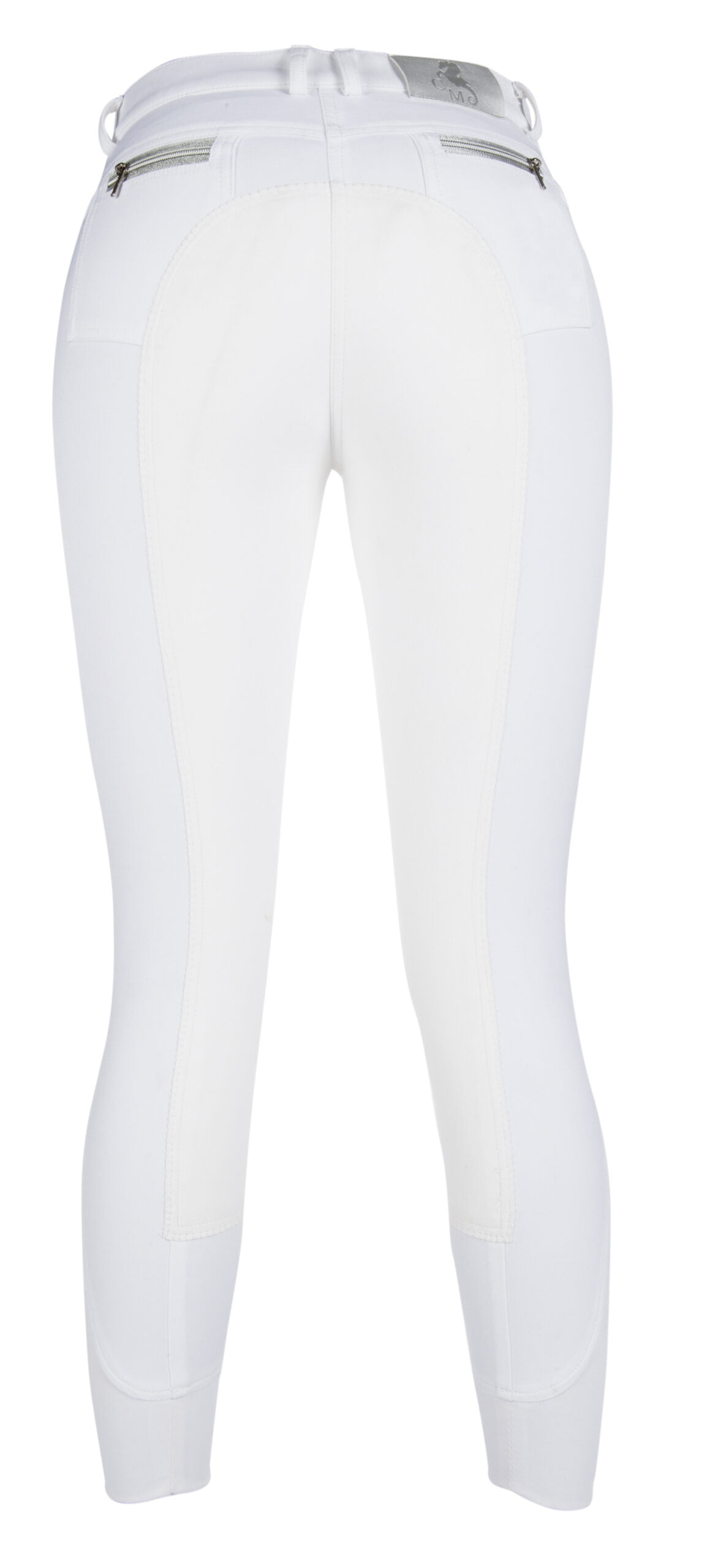 Functional details include two front pockets and a secure back pocket with zipper, perfect for small essentials. The elastic leg closure with knitted insert creates a smooth, comfortable fit under tall boots or paddock boots without bulk.
