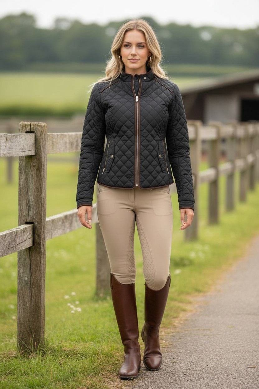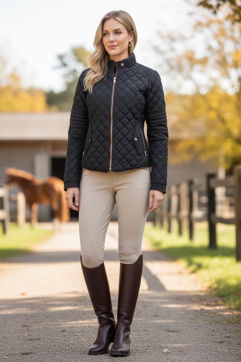 Meet your new lucky charm – the Ritzy EQ Lucky Coat with embroidered horseshoes! This stylish barn coat is designed for the modern equestrian, seamlessly blending performance and elegance. Crafted with a high-quality outer shell, this equestrian riding coat effortlessly wicks away dirt and resists staining, keeping you looking polished whether you’re in the saddle or tending to chores.