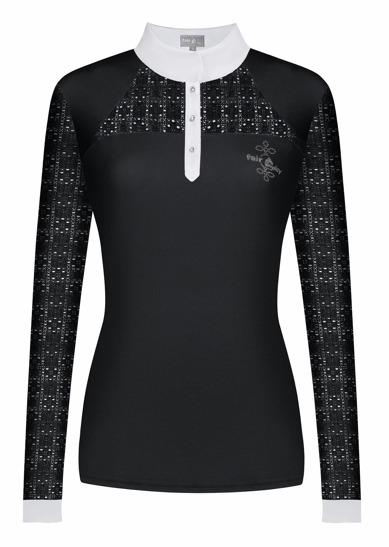 Delicate elastic lace inserts along the front, back, and sleeves enhance airflow and ventilation while adding a sophisticated, couture-inspired look. The front is finished with three decorative buttons for a classic show-ring aesthetic, while an embroidered Fair Play logo accented with subtle crystals adds a touch of understated luxury.