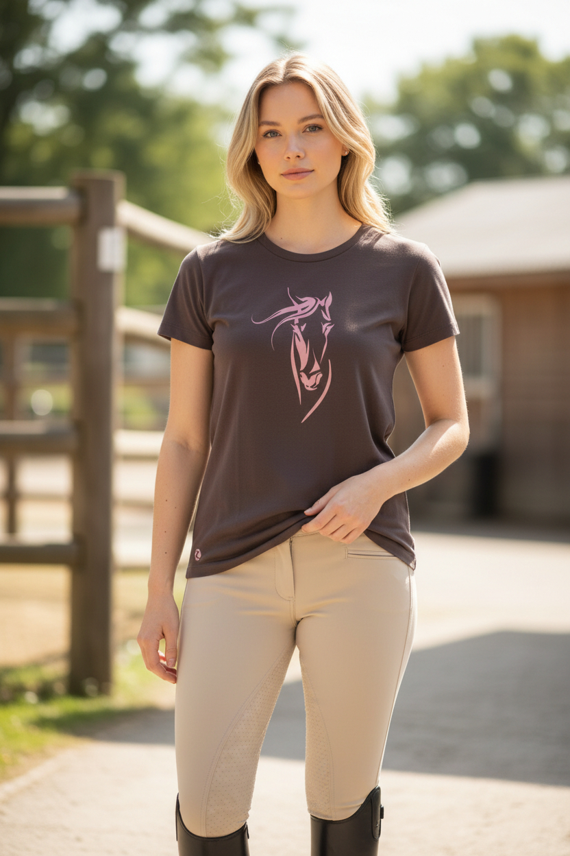 Horze Helen T-Shirt is a fun equestrian inspired t-shirt that pair fabulously with your favorite jeans or with a breech of your choice. Great color selections to mix in your favorite accessories. Bold graphics give this simple t-shirt style. Grab several of these affordable t-shirts in every fashionable color. Lovely, soft t-shirt for casual wear or riding. Fun graphics and new colors make it a fast favorite. The comfortable t-shirt will look great with breeches, shorts or jeans.